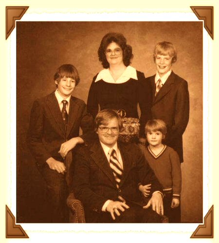 Kent Graham Jarvis, BYH Class of 1960, sitting for a portrait with his family: Ryan, left rear; Jayanne Christsensen Jarvis, standing center; Mark, right rear; and Gregory; right front, circa 1981.