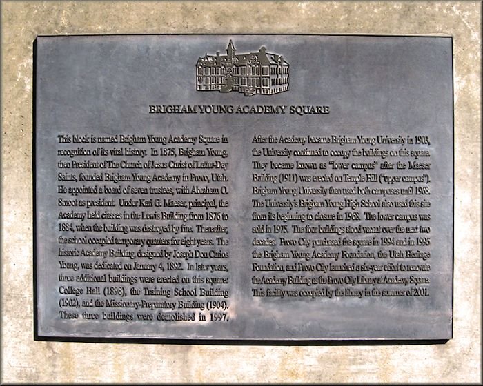 The historic Academy gate originally stood at the southwest corner entrance to the Academy square. The gate was a gift from the Brigham Young High School twelfth-grade graduation Class of 1912.