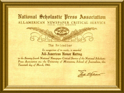 The Brigadier received recognition as an All-American newspaper by the National Scholastic Press Association, the first time a BYH student newspaper had been so honored. Most of the credit belonged to BYH Journalism Adviser 1964-1968, Harold O. (Hal) Williams, for overseeing the publication and having the confidence to submit the application. ~~Larry Christensen '66